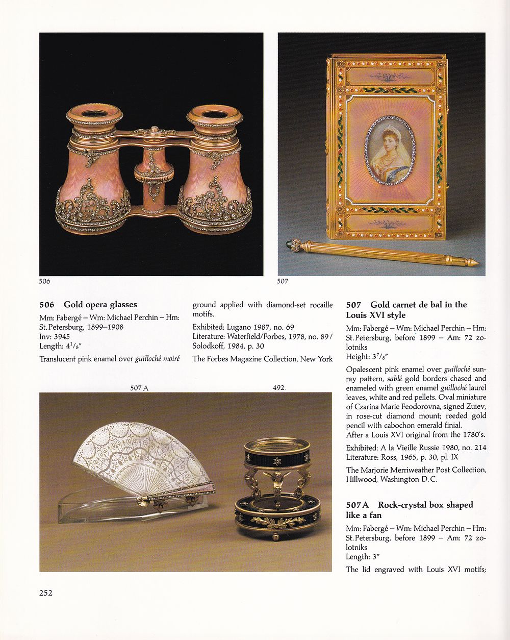 Каталог выставки, проходившей в Мюнхене с 6 декабря 1986 по 8 марта 1987 гг. На выставке было представлено более 650 предметов. Для исследователей и искусствоведов данный каталог будет уникальным подспорьем для атрибуции изделий фирмы Фаберже, так как в каталоге собрана доступная информация о подделкам. Впервые о подделках Фаберже заговорили только в 1979 году.