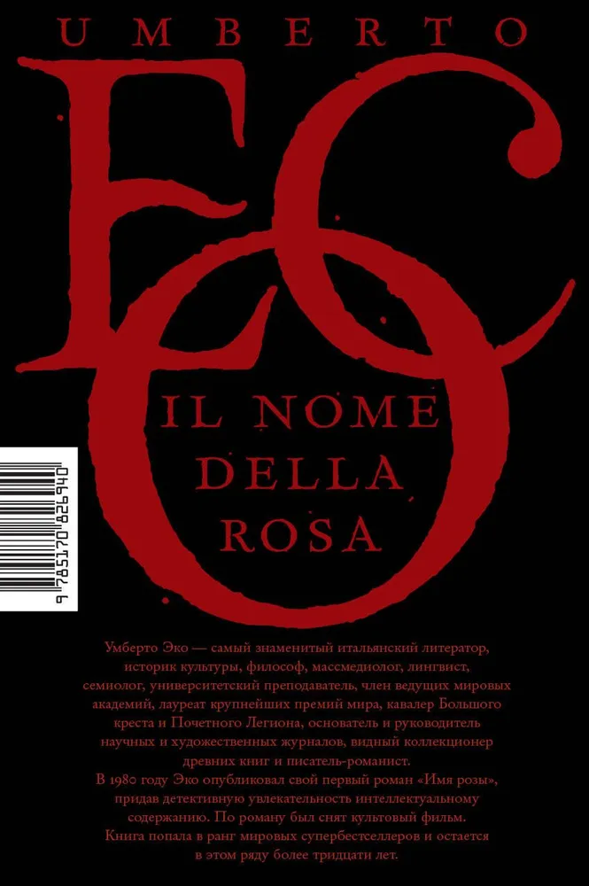 "Имя розы" - книга с загадкой. В начале ХIV века, вскоре после того, как Данте сочинил "Божественную комедию", в сердце Европы, в бенедиктинском монастыре обнаруживаются убитые. Льется кровь, разверзаются сферы небес. Череда преступлений воспроизводит не английскую считалочку, а провозвестия Апокалипсиса. Сыщик, конечно, англичанин. Он напоминает Шерлока Холмса, а его юный ученик - доктора Ватсона. В жесткой конструкции детектива находится место и ярким фактам истории Средневековья, и перекличкам с историей ХХ века, и рассказам о религиозных конфликтах и бунтах, и трогательной повести о любви, и множеству новых загадок, которые мы, читатели, торопимся разрешить, но хитрый автор неизменно обыгрывает нас... Вплоть до парадоксального и жуткого финала.