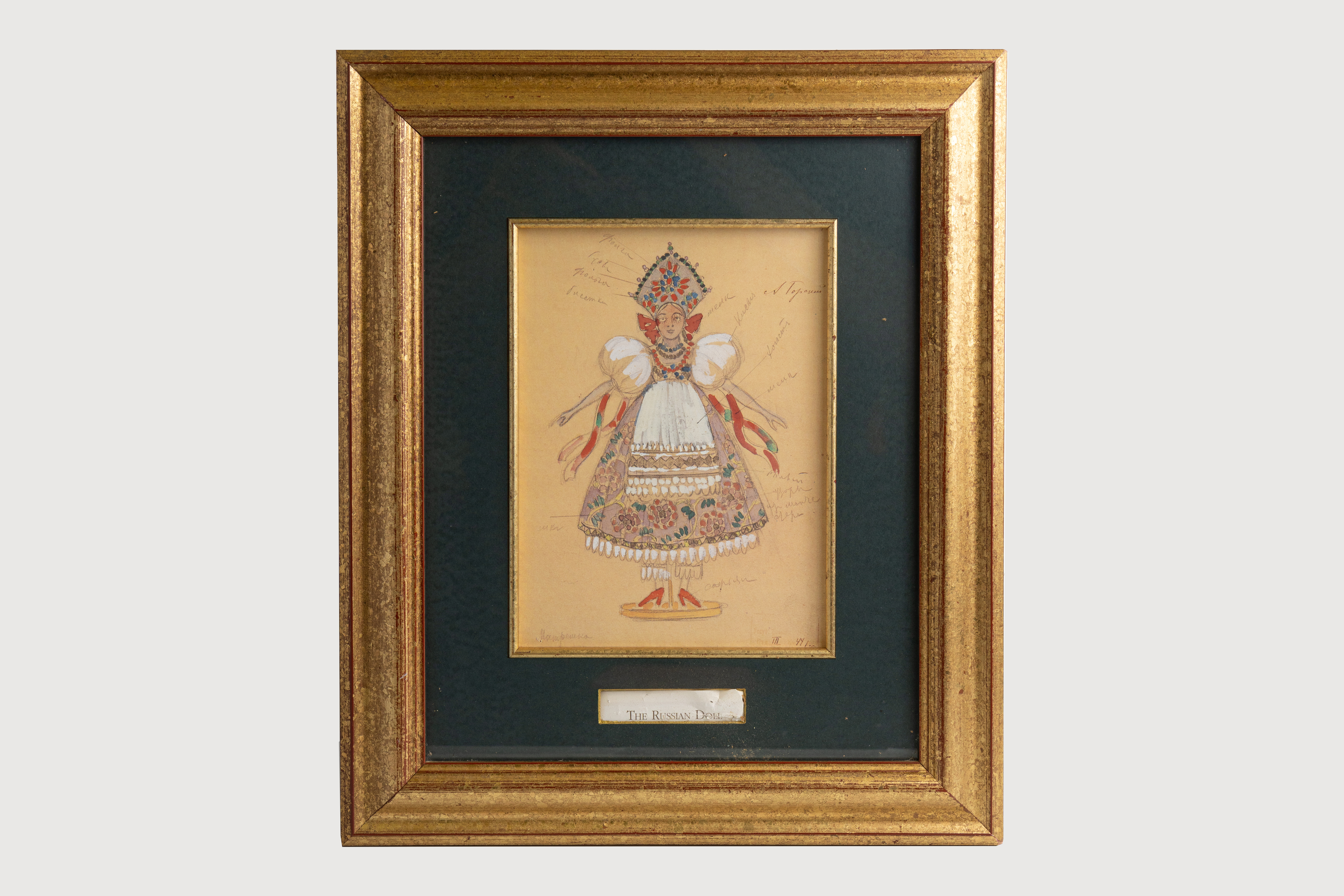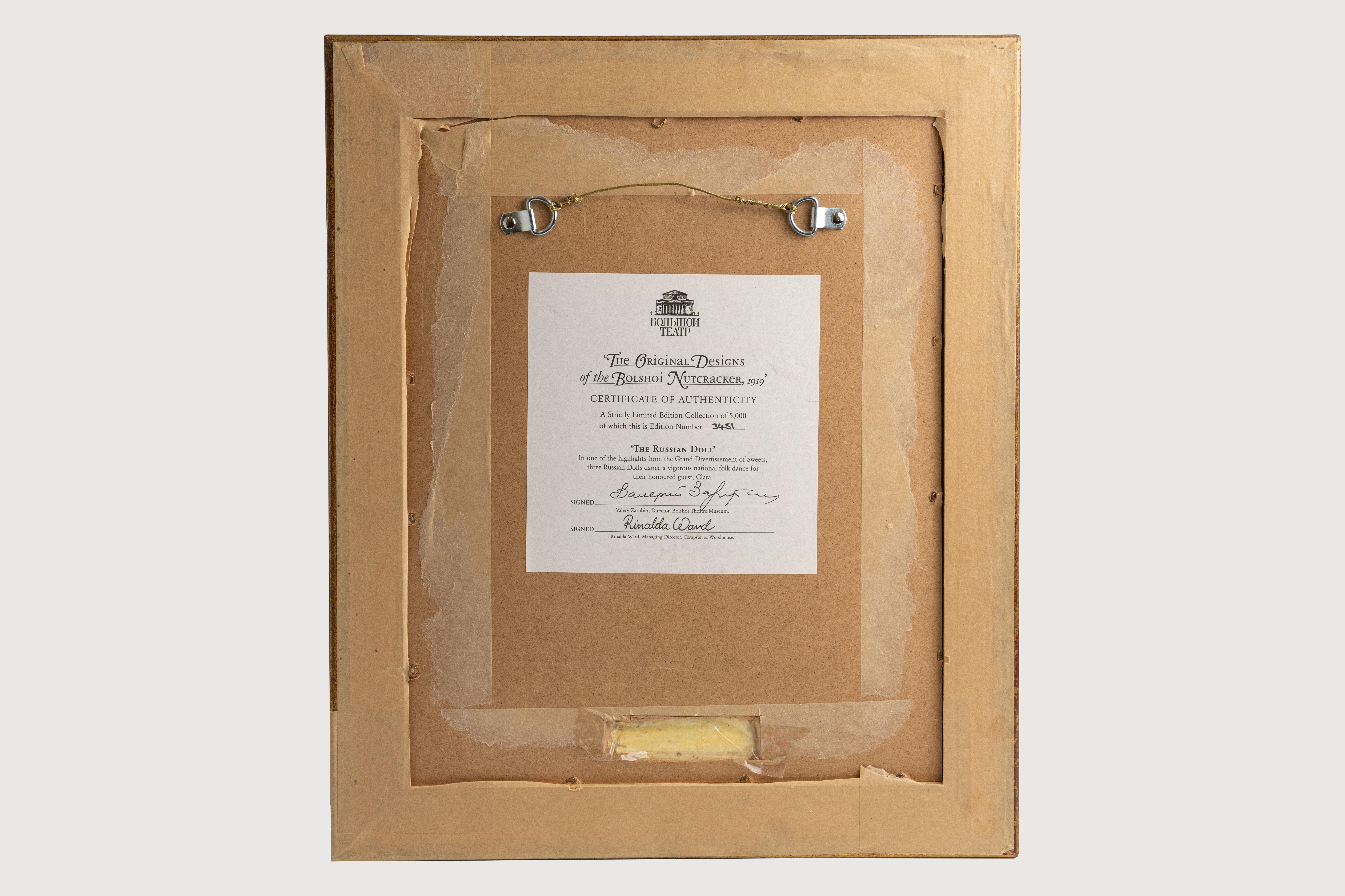 В позолоченной раме со стеклом, паспарту. Надпись с названием и указанием уникального номера смещена и ее необходимо прикрепить снова, рассохся клей. На обороте владельческая надпись черным маркером "7" и прикреплен оригинал сертификата, подтверждающий номер копии " 3451/5000" с подписью Валерия Зарубина, директора музея Большого Театра, и подписью Ринальды Вард, управляющего директора британской компании Compton & Woodhouse (1990-2008).