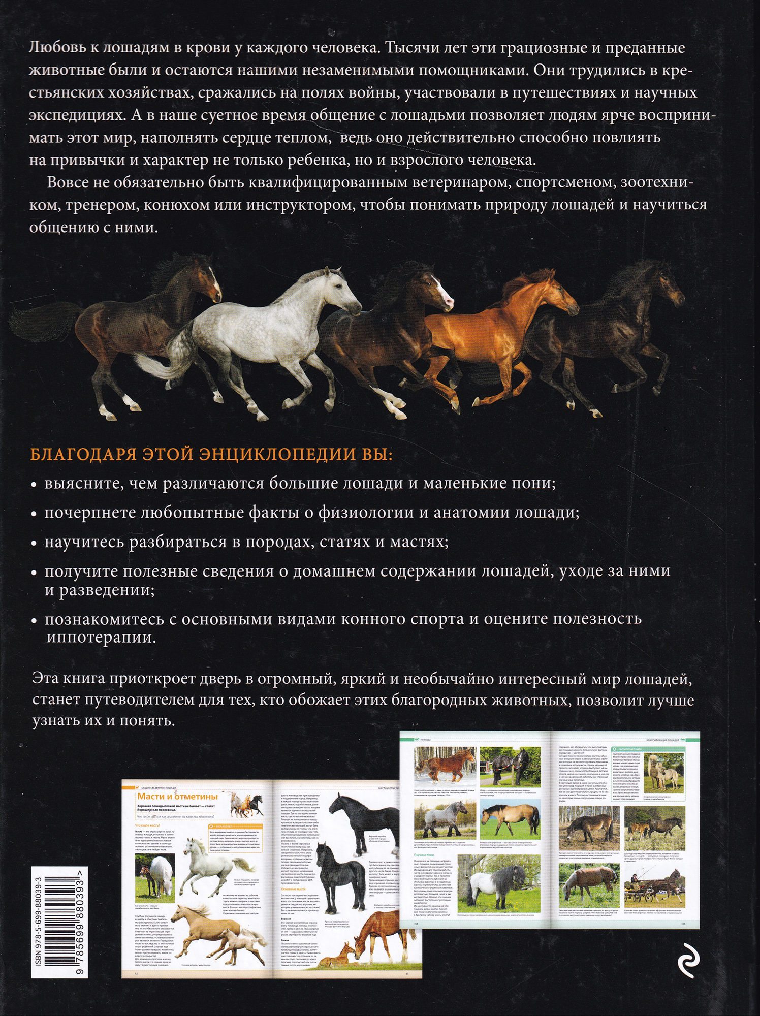 Эта книга станет путеводителем по миру лошадей, позволит лучше узнать и понять этих благородных животных и верных помощников человека. Вы найдете информацию о предках и родственниках этих животных; выясните, чем отличаются большие лошади и маленькие пони; почерпнете некоторые любопытные факты о физиологии и анатомии лошади; научитесь разбираться в породах, статях и мастях; получите полезные сведения о домашнем содержании лошадей, уходе за ними и разведении; познакомитесь с основными видами конного спорта и оцените полезность иппотерапии.