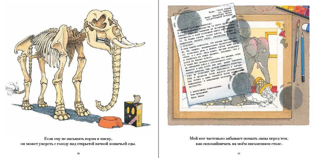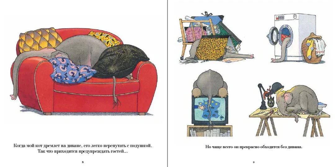 Изюминка этих книг, прежде всего, в иллюстрациях, отражающих нестандартное мышление автора, ведь говоря о своём коте, он неизменно рисует слона, изображая его в узнаваемых кошачьих позах и ситуациях, и тем самым вовлекая нас в неожиданную, тонкую и необыкновенно остроумную игру смыслов, которой читатели самых разных возрастов смогут насладиться каждый по-своему.