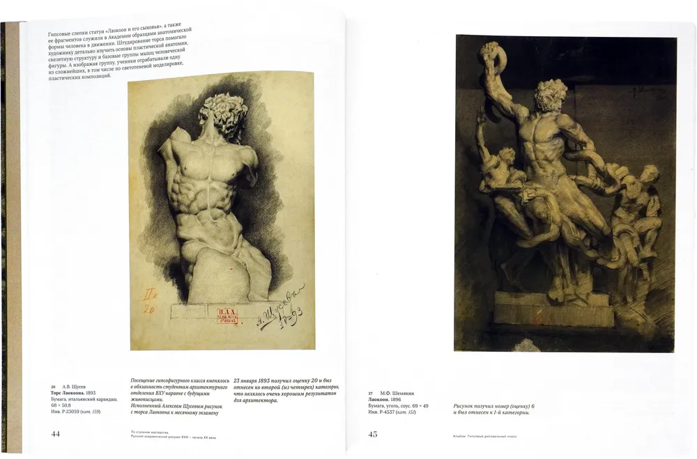 В альбомной части издания представлены учебные рисунки выдающихся русских художников А. Е. Егорова, О. А. Кипренского, К. П. Брюллова, А. А. Иванова, И. Н. Крамского, И. Е. Репина, В. Д. Поленова, В. И. Сурикова, М. А. Врубеля, М. Ф. Ларионова и многих других. Отдел графики XVIII - начала XX века Третьяковской галереи располагает значительным собранием произведений, связанных с ИАХ, МУЖВЗ, а также с различными мастерскими. Часть их до нынешнего дня оставалась неизвестной зрителям и специалистам и публикуется впервые.