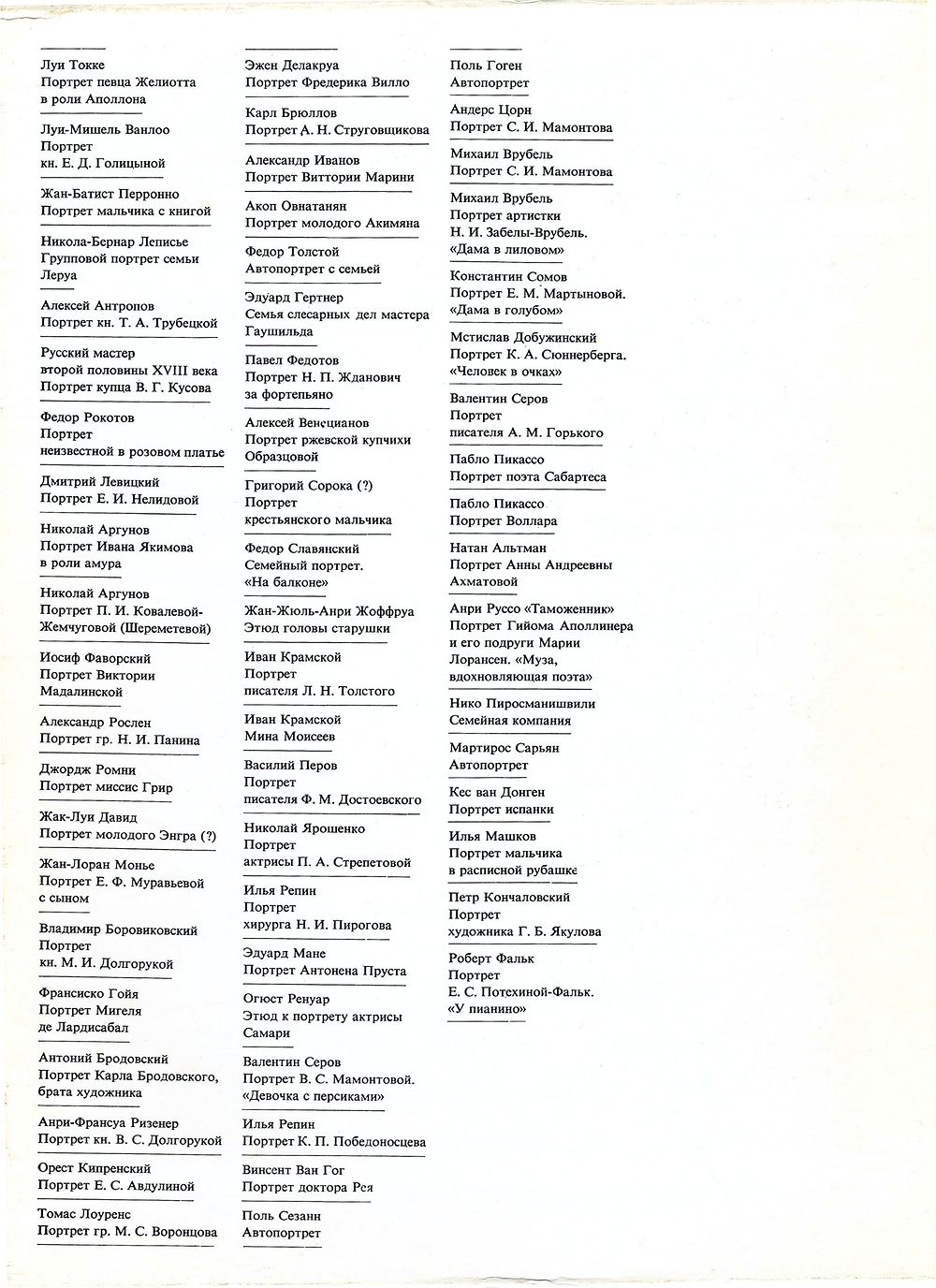 Альбом является каталогом выставки Государственного музея изобразительных искусств имени А.С. Пушкина. На выставке были представлены произведения в жанре портрета работы Джентиле Беллини, Леонардо да Винчи, Лукаса Кранаха Старшего, Тициана, Диего Веласкеса, Франса Халса, Ивана Вишнякова, Мартироса Сарьяна, Ильи Репина, Пабло Пикассо, Натана Альтмана и др.