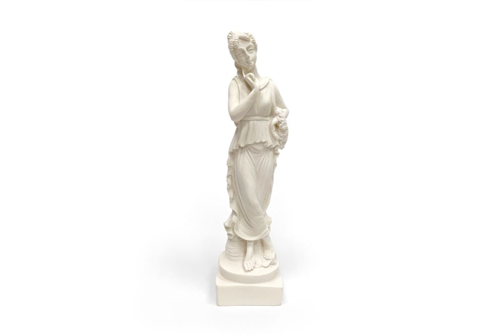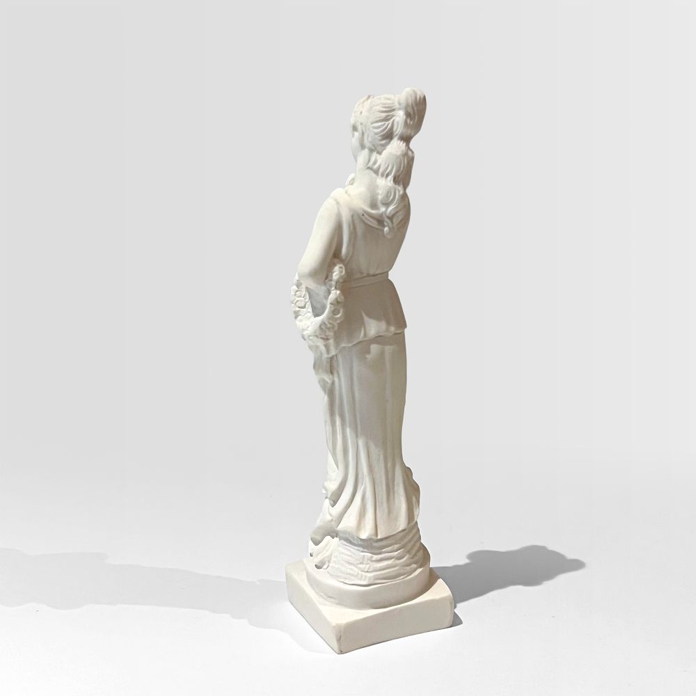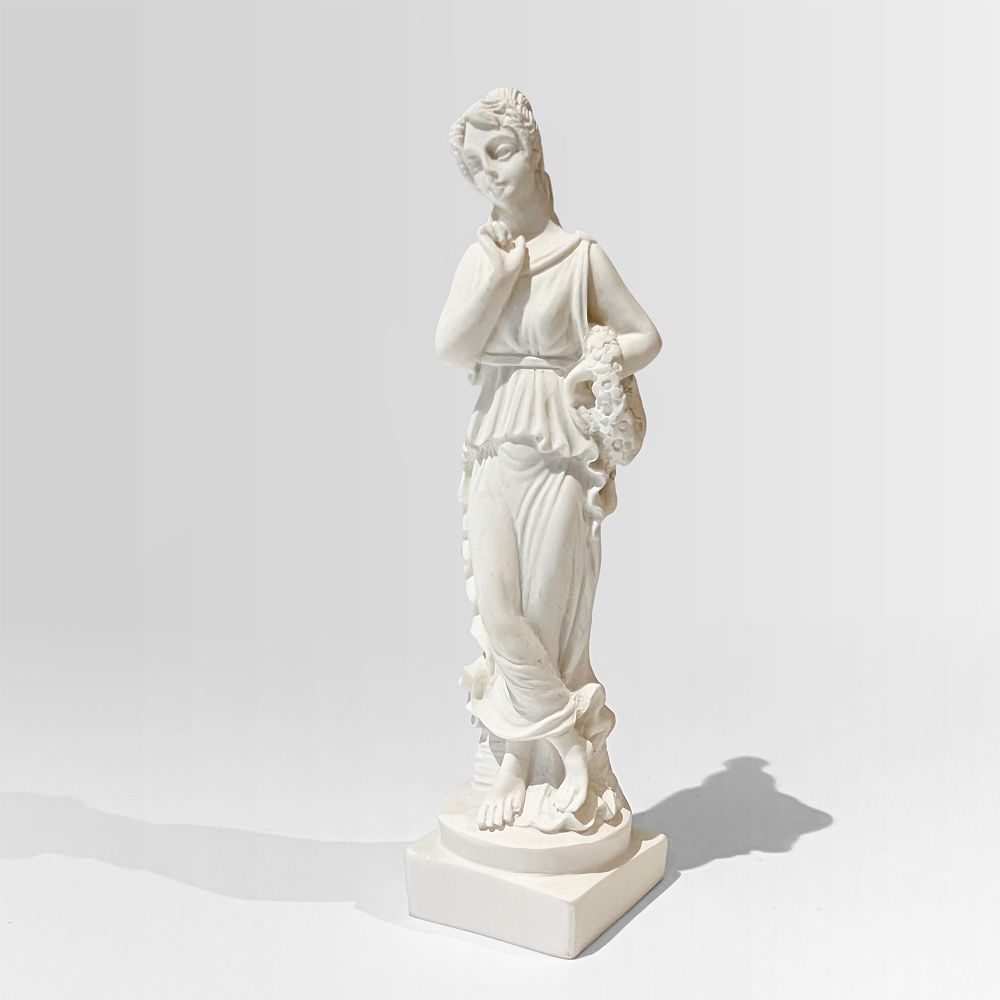 Изображение молодой женщины в хитоне, держащей в руках цветы или плоды (вероятно, аллегория Весны или одна из муз). Фигура отличается грациозной осанкой и детальной проработкой драпировки одежды. Статуэтка выполнена из белоснежного алебастра, который обладает приятной матовой текстурой и легким благородным блеском. Тонкая проработка деталей: складок ткани, прически и анатомических линий.