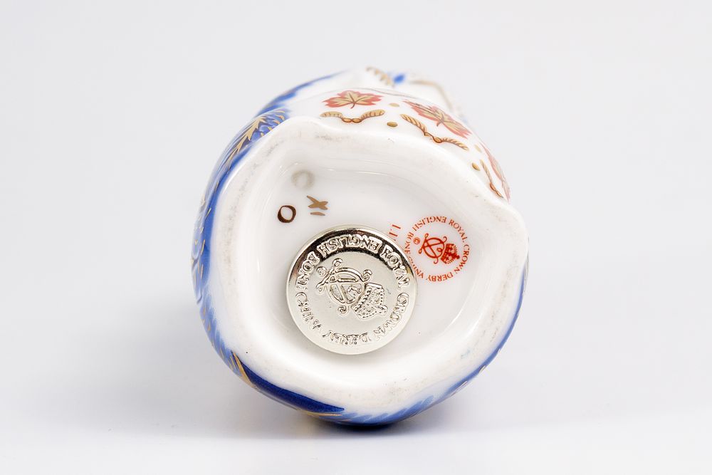 На основании металлическая накладка с гравировкой и марка «Royal Crown Derby / English Bone China», номер изделия LII, от руки "XI", "О"